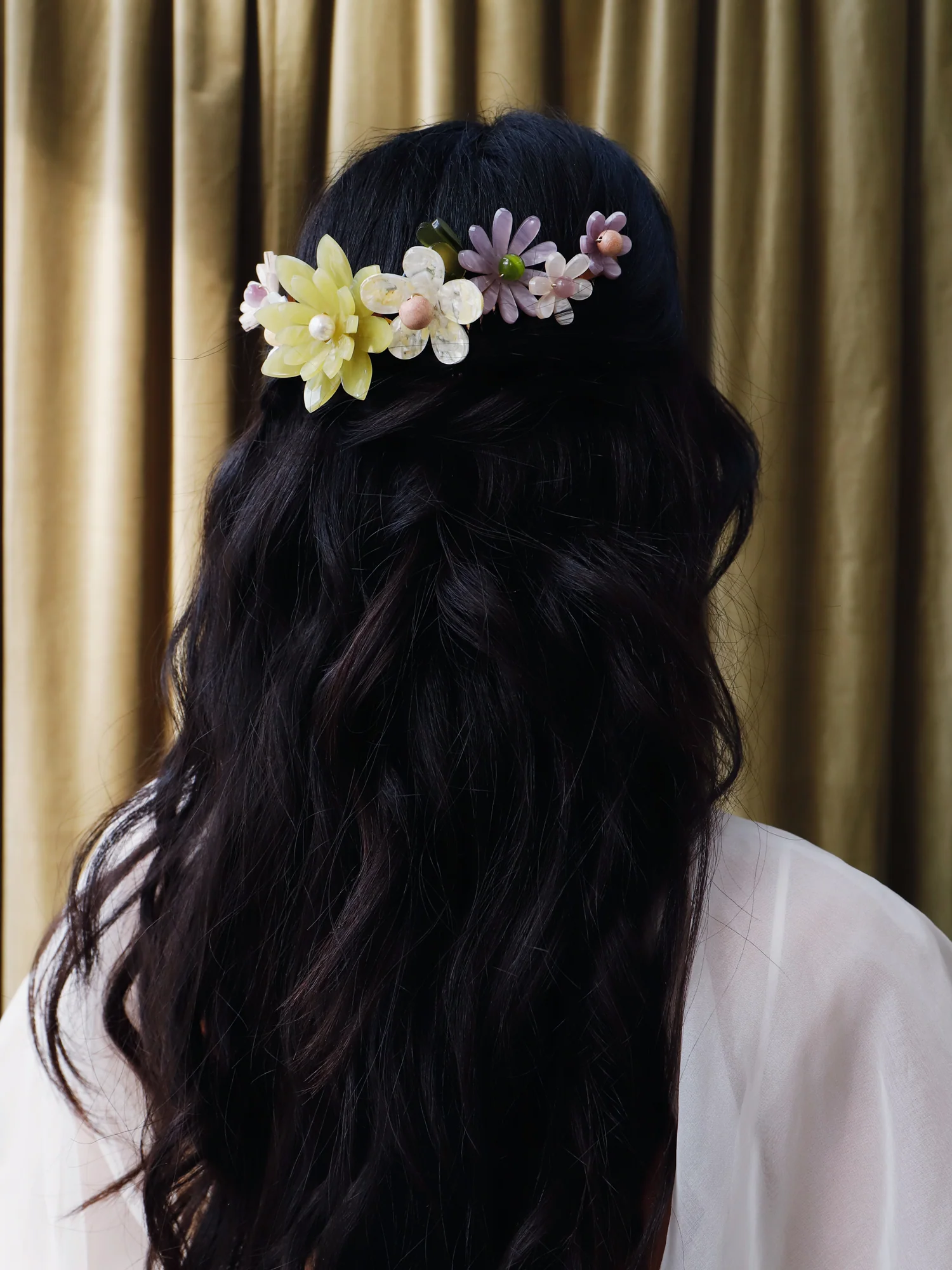 Model wears flowers on gold-tone combs.