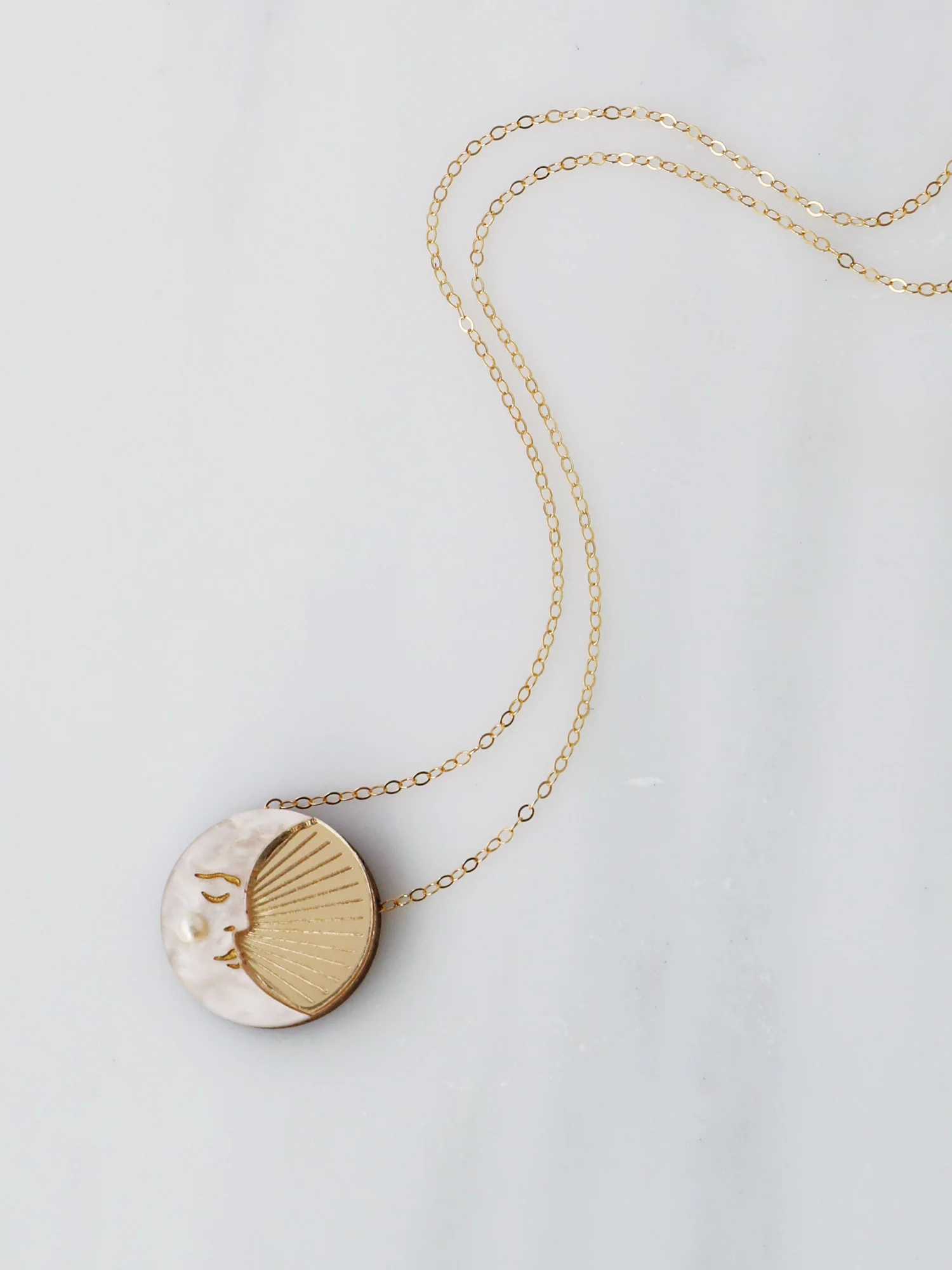 Our dreamy moon necklace is crafted using gold mirror & cream marbled acrylic with a hand-drawn illustration and glass pearl detail.